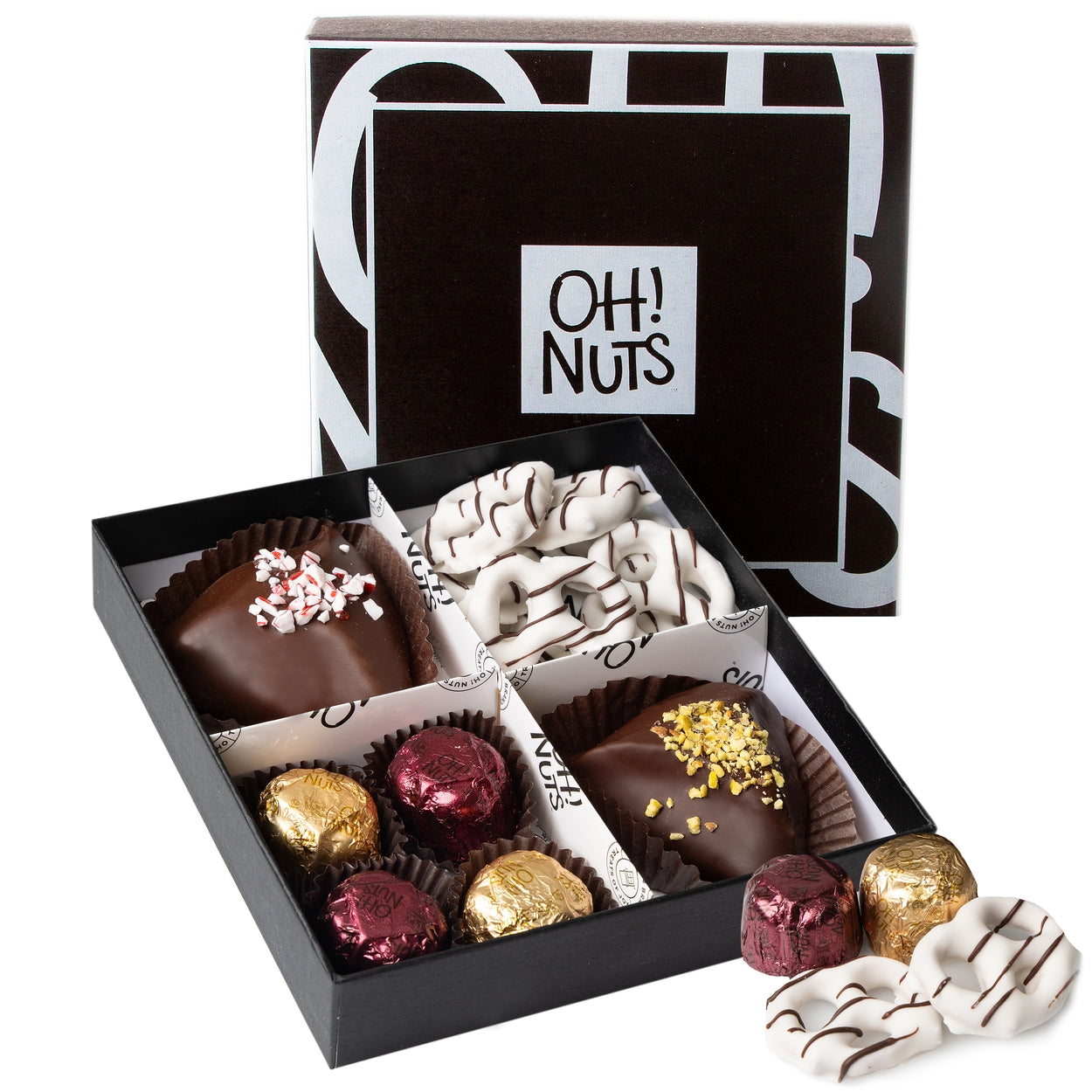 The black and white hard cardboard box with the memorable Oh! Nuts logo bespeaks of elegant Kosher gift choices. In time for Purim, we've stocked this gift box with four sections of Purim goodies. The traditional Purim pastry, the Hamantasch, goes gourmet in our trio of Hamantaschen. Each of the soft, fresh Purim cookies are hand-dipped in luscious chocolate coating and then garnished to be a work of art and taste. Foil-wrapped fine chocolate truffles completes this classy Shalach Manos ensemble. Whether sending Purim Kosher corporate gifts, ordering bulk Mishloach Manos boxes to hand out to friends and neighbors, or relying on the easy Oh! Nuts option of having Purim baskets shipped far and wide cross-country this Purim season, this teal and black Purim gift box will be savored and enjoyed. Shalach Manos that is absolutely yummy!